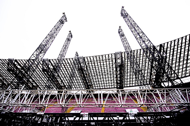 The Litec MyT Folding Steroid Roof System is a modular, completely self-contained roof environment that’s a hybrid of folding EN AW-7003 T6 aluminium mother grid truss sections (allowing for a 63% decrease in width), 85 × 85 cm EN AW-6082 T6 aluminium towers and key structural elements in high strength S355 steel such as modular ballast bases, sleeve block and safety block. Integral structural parts are assembled without welding to optimize performance & eliminate issues related to heat affected zones.