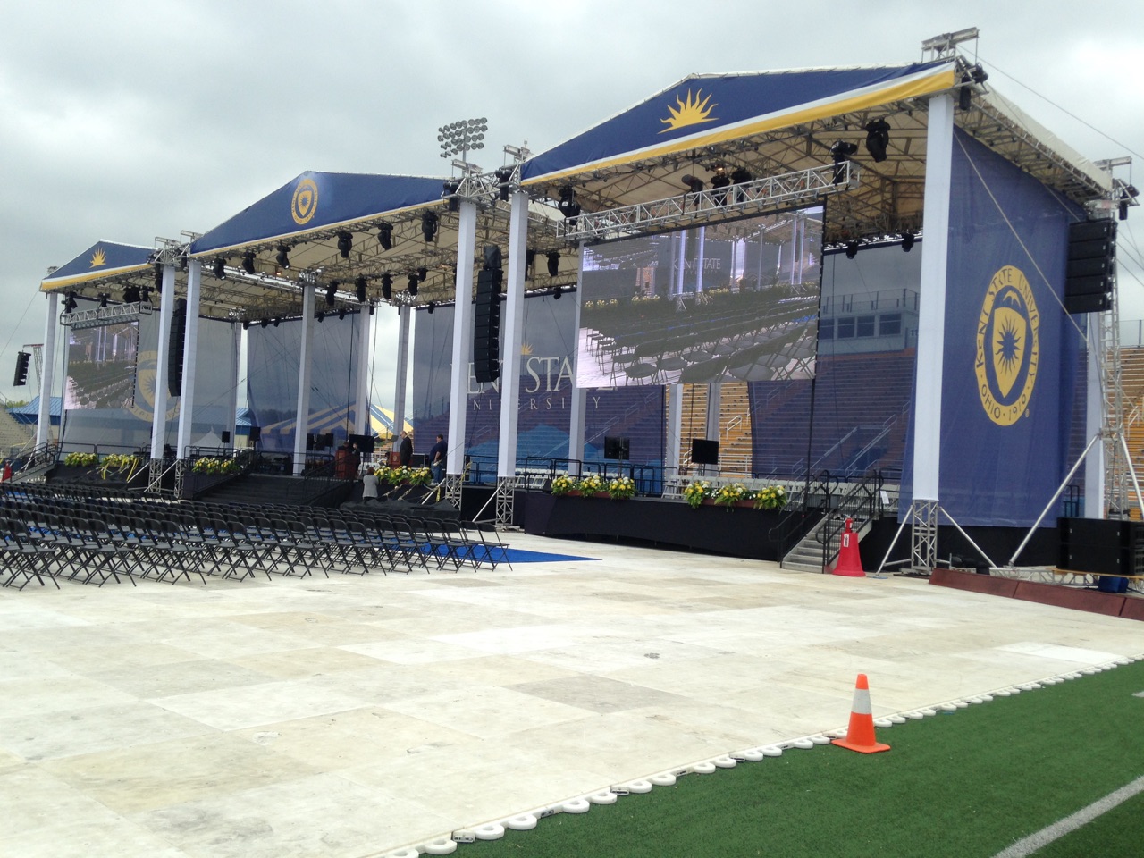 PRT roof structures for their recent commencement ceremony. PRT systems are James Thomas Engineering Pre-Rig Super Truss roof systems with 38.1mm (15 inch) towers. They measure 12.2 x 12.2 metres (40 x 40 feet), with the center roof having an additional mid-stage span. The structures are tied together with Pre-Rig SuperTruss, which forms the sound bays. All structures were provided by KO Management (photos by Ken Olsen).