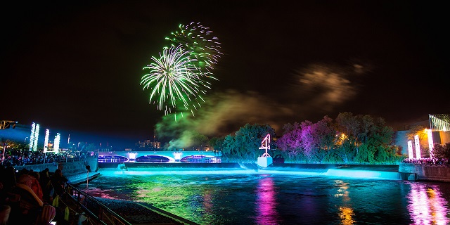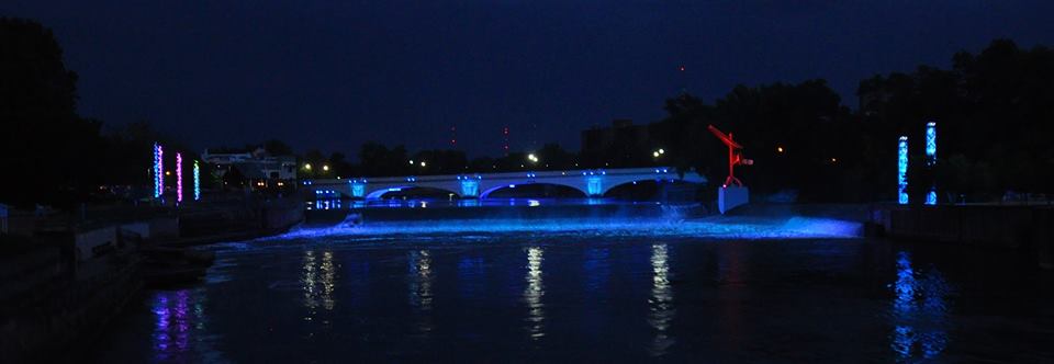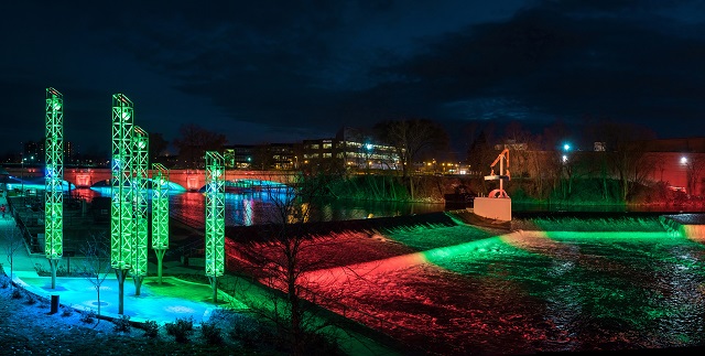 The unique, interactive lighting display is made up of five components: The Jefferson St. bridge, the “Keepers of the fire” sculpture, the downstream crescent that lights up the cascades, the trio sculpture on Century City Island, and the Forest Towers directly across the river at Seitz Park.
